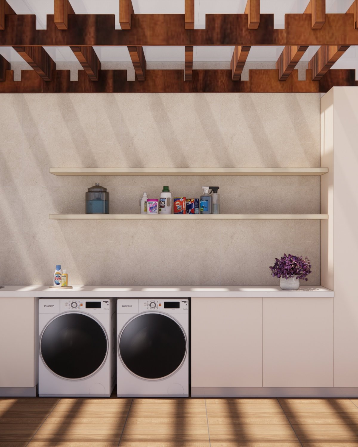 A lavanderia L&F veio com uma proposta simples, um local funcional e bonito, com espaço de armário, bancada grande, tons claros, revestimento em travertino, bancada em quartzo branco, pergolado em vidro e madeira e espaço para máquinas de lavar roupa, cumprindo o programa de necessidades solicitado pelos clientes.